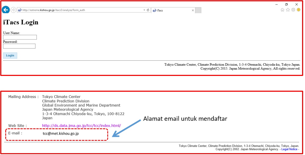 Akan muncul halaman untuk login. Jika belum terdaftar, maka kita bisa login dengan mengirim email ke pihak admin Tokyo Climate Center pada alamat di bawah ini.