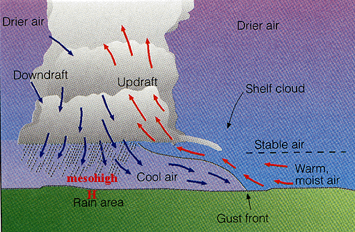 Udara turun bersifat dingin, ketika mencapai tanah akan mendorong udara lembab dan hangat naik mengikuti arus updraft. Udara hangat ini ada yang masuk ke dalam awan CB dan ada juga berkondensasi membentuk shelf cloud di luar awan CB.